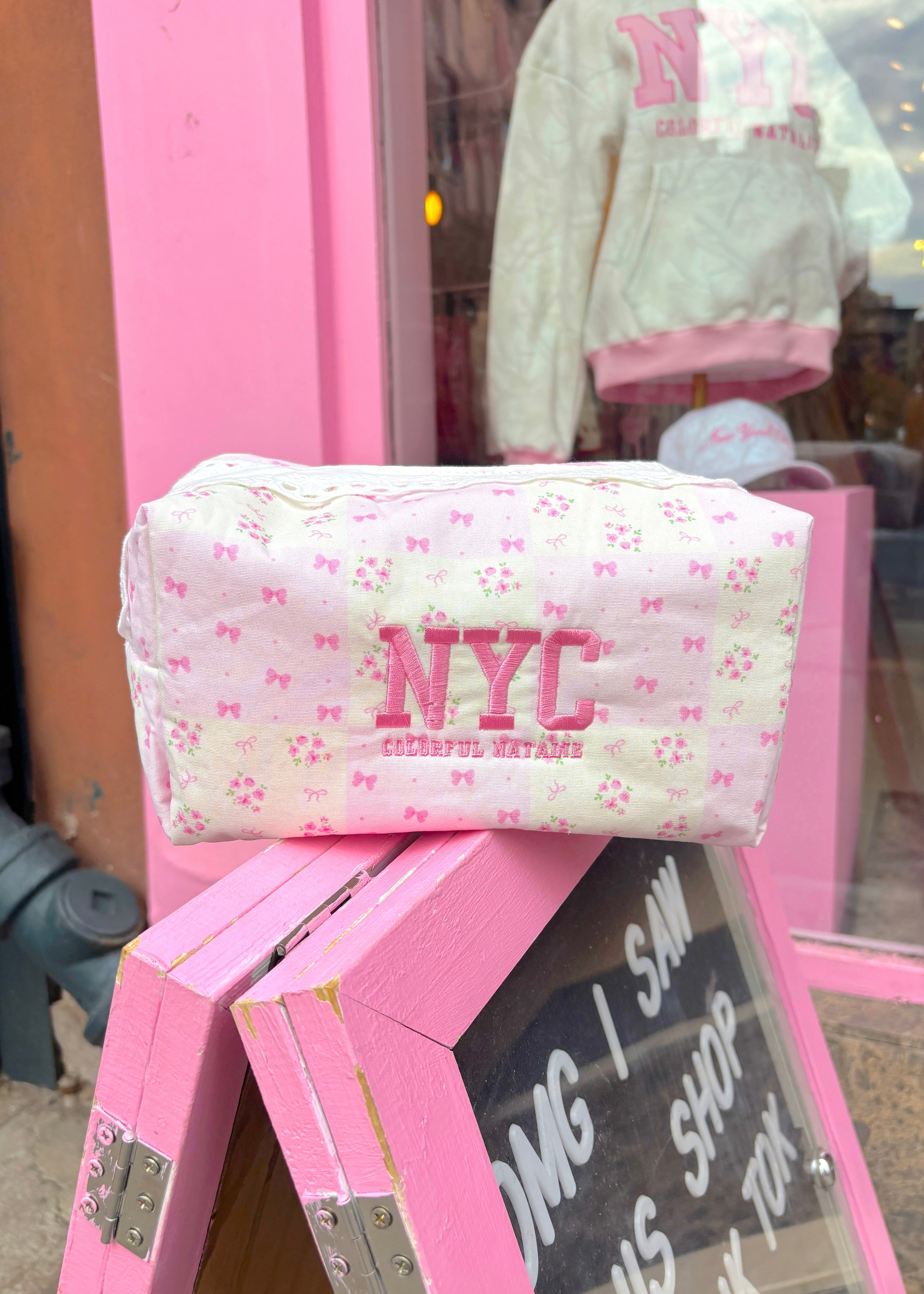 Pink bow patchwork makeup bag with embroidered pink text